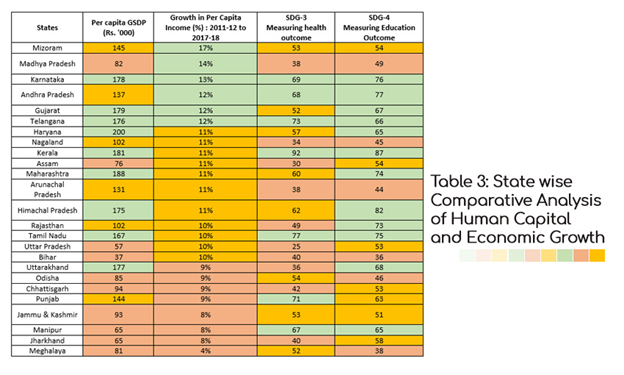 Economic growth does not always lead to human capital growth. The relation between increase in per capita income and investment in education and health is analyzed in the chart below which shows the gap in the conversion of economic growth into education and health growth for the states. For example, Maharashtra saw a growth of 14 percent contribution to the overall GDP. But despite having growth in income their sustainable goals are at the lowest. On the other hand, if you take Kerala, Telangana or even Mizoram, their economic growth and their sustainable development goals have increased. These are the states which invest in their human capital the most.